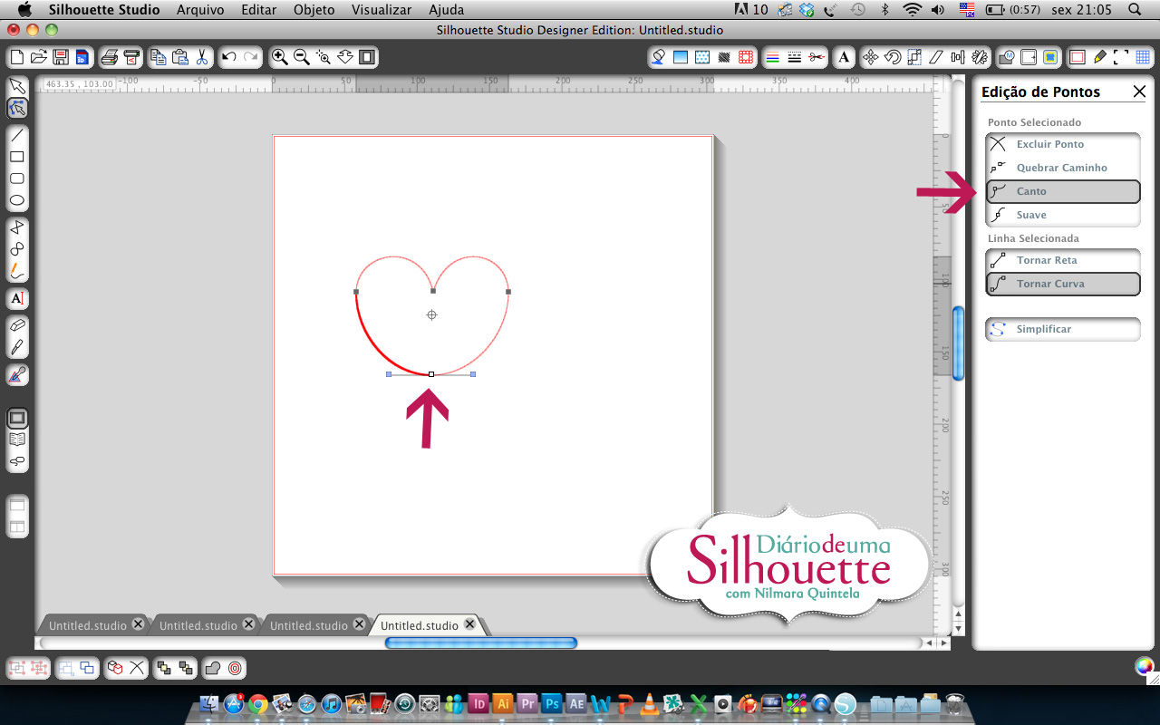 Para começar a dar forma ao coração, precisaremos mexer nas alças. Se vocês começarem a desloca-las, perceberão que ao mover uma, a outra tbm se move. Isso porque o nó está como nó Suave (na janela edição de pontos a direita mostra a propriedade do ponto selecionado). Para o desenho do coração, é necessário mudar a propriedade do nó, para nó Canto.