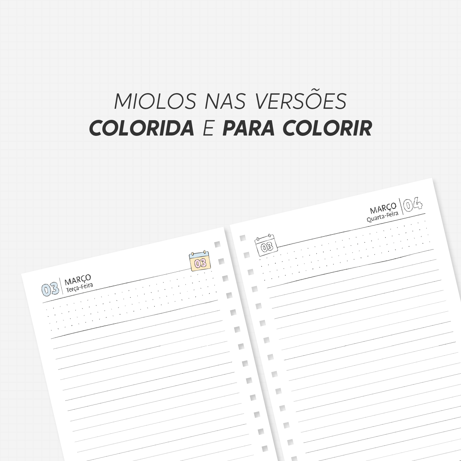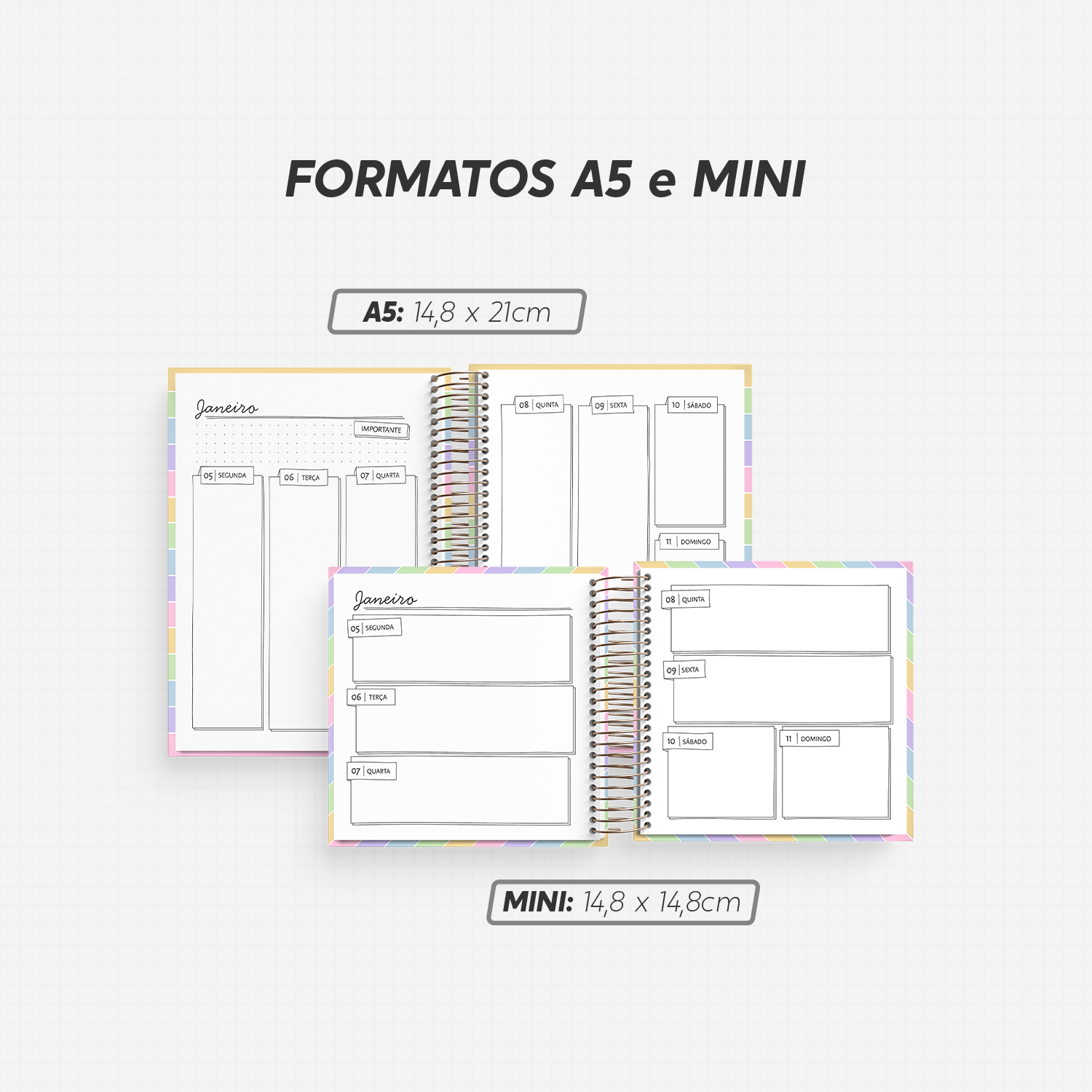 - Tamanho do miolo impresso: A5 (14,8cm x 21cm) e Mini (14,8cm x 14,8cm)